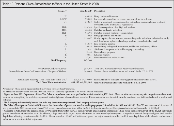 The above statistics paint a very bleak picture for unemployment among immigrants and natives. The unemployment rate was 9.7 percent for immigrants overall and 8.6 percent for natives. At present the United States has not changed its immigration policy in any significant way in response to the recession. Table 10 reports the number of individuals given authorization to work in the United States (temporary and permanent) in fiscal year 2008. The table shows that more than 1.3 million new individuals were authorized to work in the United States in 2008 on a temporary or permanent basis. If we include adult illegal aliens who were given permanent residence (a “green card”) from within the United States, which confers work authorization, we would have to add another 100,000 to 250,000 new individuals to this total. The very high unemployment of immigrants overall, and the rapid increase in unemployment even among educated immigrants, calls into question the wisdom of bringing in so many foreign workers. This is especially true when one considers that the unemployment rate for the most recently arrived immigrants is 13.3 percent.
