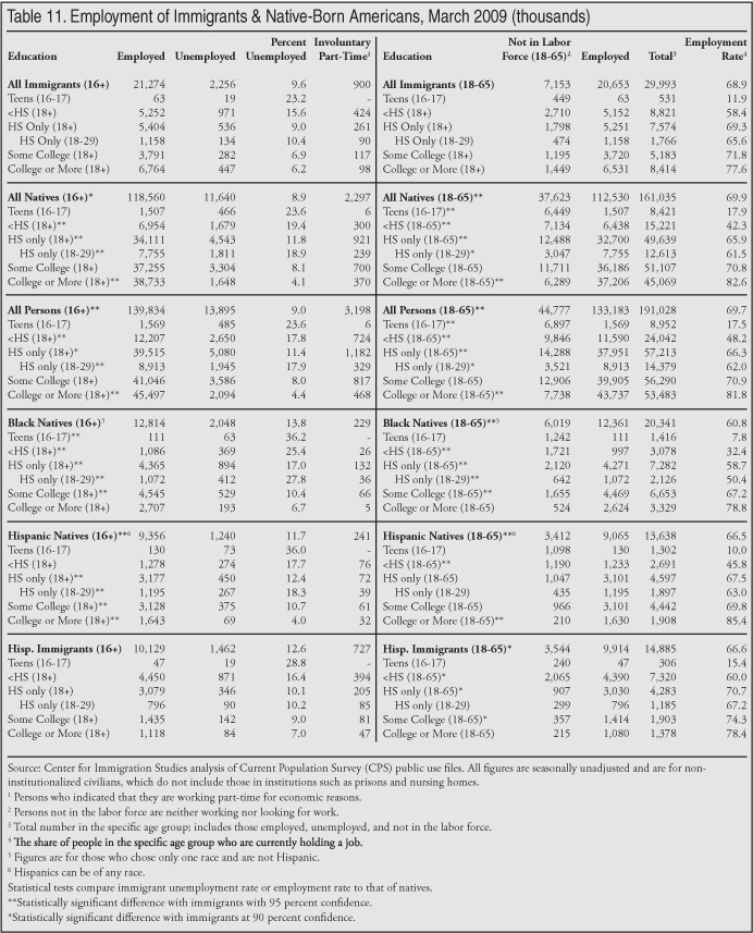Table 1 shows the unemployment rate for immigrants and native-born Americans in first quarter of 2009.3 The left side of the table compares employment and unemployment; the right side looks at those in and out of the labor force. To be in the labor force one has to either be working or looking for work. The statistical tests in the table compare either the unemployment rate on the left side of the table or employment rate on the right side to the same educational category of immigrants. So, for example, the overall native-born unemployment rate of 8.6 percent is statistically lower than the overall foreign-born unemployment rate of 9.7. However, the 7.8 percent unemployment rate for natives with some college is not statistically different from the 7.7 percent unemployment rate for immigrants with some college. It is important to note that in some cases the foreign-born have higher unemployment while in others the native-born have higher rates. The asterisks only indicate whether the difference is statistically significant.