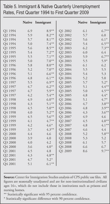 Figure 3 shows quarterly immigrant and native unemployment data going back to January 1994, when the Census Bureau began to identify immigrants in the monthly Current Population Survey. We report statistical significance tests for unemployment rates for every quarter going back to 1994 in Table 5. Figure 3 shows that from 1994, when the government started to collect separate immigrant data, until 2000 natives had statistically significant lower unemployment rates in almost every quarter. This is also the case for most of 2001, 2002, and 2003, but the general trend was toward convergence. By 2004 there was no meaningful difference between the two groups for the entire year. Beginning in 2005 and running through the third quarter of 2007 immigrants had lower unemployment rates in virtually every quarter. Clearly, the historical pattern had reversed, with immigrants now enjoying lower levels of unemployment. As we have seen, since the third quarter of 2007 immigrant and native rates began to converge and immigrants now have the higher rate of unemployment.