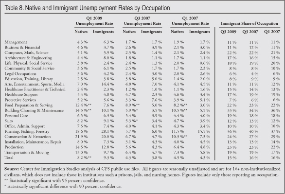 Table 8 shows that in a few occupations immigrants have statistically lower unemployment than natives in the first quarter of 2009. This is the case in all three quarters. Table 9 shows that the numerical increase in unemployment for immigrants between the third quarter of 2007 and the first quarter of this year was 1.262 million for those who gave an occupation. Of this increase, 26 percent was due to a rise in unemployment among immigrant construction workers. Among natives, construction accounted for 21 percent. In production jobs, unemployment accounted for 13 percent of the increase in immigrant unemployment and for natives production jobs accounted for 12 percent of the increase in unemployment. Building cleaning and maintenance accounted for 9 percent of the increase in unemployment for immigrants and 7 percent for natives. Sales accounted for 9 percent of the increase in unemployment for both groups. Transportation and moving was 7 percent of the increase for immigrants and 11 percent for natives. Farming, fishing, and forestry accounted for 7 percent of the increase in the number of unemployed immigrants, but only 2 percent for natives. Office and administrative support accounted for 12 percent of the increase in unemployment for natives but only 5 percent for immigrants. If we use the first quarter of 2007 as our point of comparison, we still get very similar results.