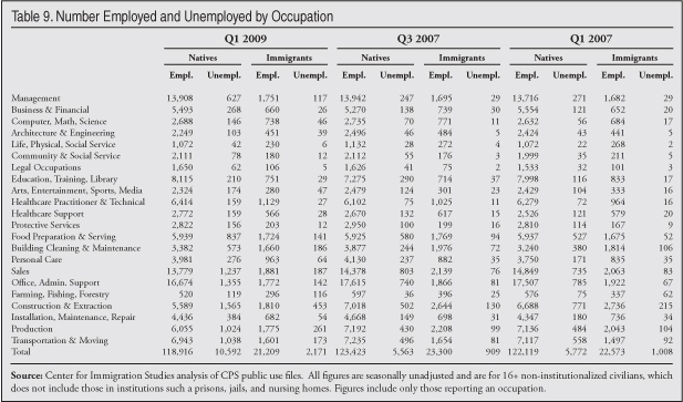 Table 8 shows unemployment rates by occupation in the first quarter of 2009 and the third quarter of 2007. Table 9 shows the number of immigrants and natives employed and unemployed. Since occupations vary a lot by season, we also include the first quarter of 2007 to compare with the first quarter of this year. It should be noted that the statistics in Tables 8 and 9, including the totals, are only for persons who reported an occupation — a modest number of the unemployed do not give an occupation. Excluding those who do not report an occupation, while creating consistency in the data, lowers the number of unemployed people and as a result the unemployment rate. Employed people in almost every case give an occupation so there is no impact on the totals for the number employed.