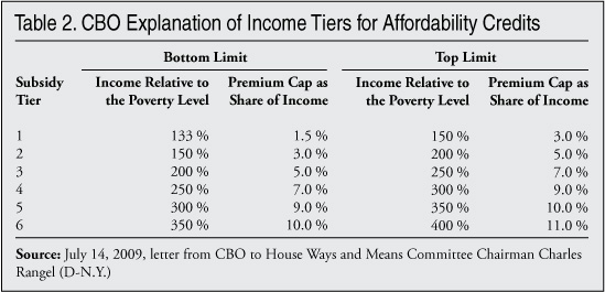 11 In a letter to Rep. Rangel dated July 14, 2009, CBO shows how the affordability credit might work by income level. The largest subsides are for those with the lowest incomes. Table 2 in this report comes directly from the July 14 CBO letter. See page 2, at http://www.cbo.gov/ftpdocs/104xx/doc10430/House_Tri-Committee-Rangel.pdf.