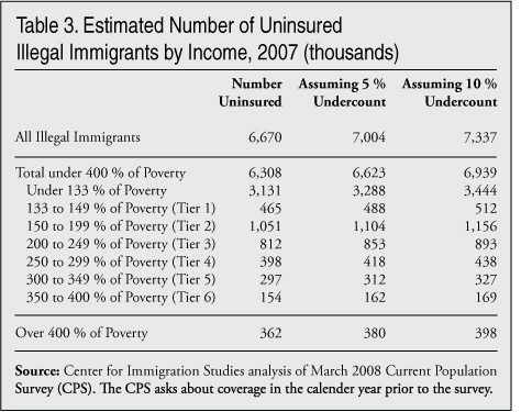 - We estimate that there were 6.6 million illegal immigrants without health insurance in 2007 who had incomes below 400 percent of the poverty level, which is the income ceiling for the proposed affordable premium credits.
