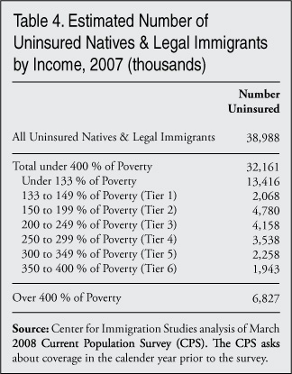 13 Based on our analysis of the March 2008 CPS, we estimate that 78 percent of illegal immigrants with incomes under 400 percent of poverty and who are uninsured fall into the 18 to 40 age group. In contrast, 46 percent of legal immigrants and native-born Americans fall into this age group.