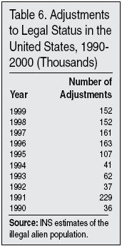 One more indicator of the interconnection of illegal and legal immigration is the increased rates of adjusting status within the United States. The Department of Homeland Security's figures show a general rise from 1990 to 2000 (with an exceptional spike in 1991 from the IRCA amnesty). As Table 6 indicates, adjustments of status by illegal aliens not having to leave the country went from 36,000 in 1990 to 152,000 in 1999.42