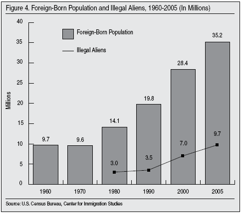 - The share of the foreign-born population who are illegal aliens has risen steadily. Illegal aliens made up 21 percent of the foreign-born in 1980, 25 percent in 2000, and 28 percent in 2005.