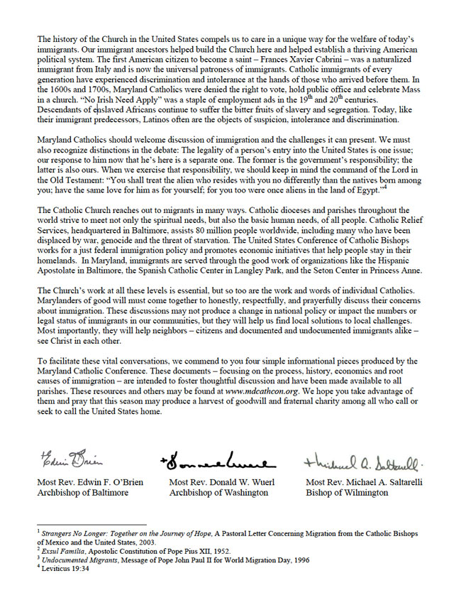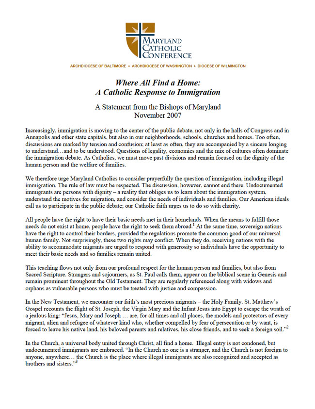 The following are considerations offered by someone engaged in the complex arena of Christian ministry. They are reflections by a Christian pastor, a minister in the Roman Catholic tradition, prompted by a statement on immigration issued in November 2007 by the three Bishops of Maryland — Edwin F. O’Brien of Baltimore, Donald W. Wuerl of Washington, and Michael A. Saltarelli of Wilmington — entitled “Where All Find a Home: A Catholic Response to Immigration.”