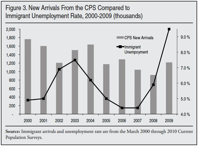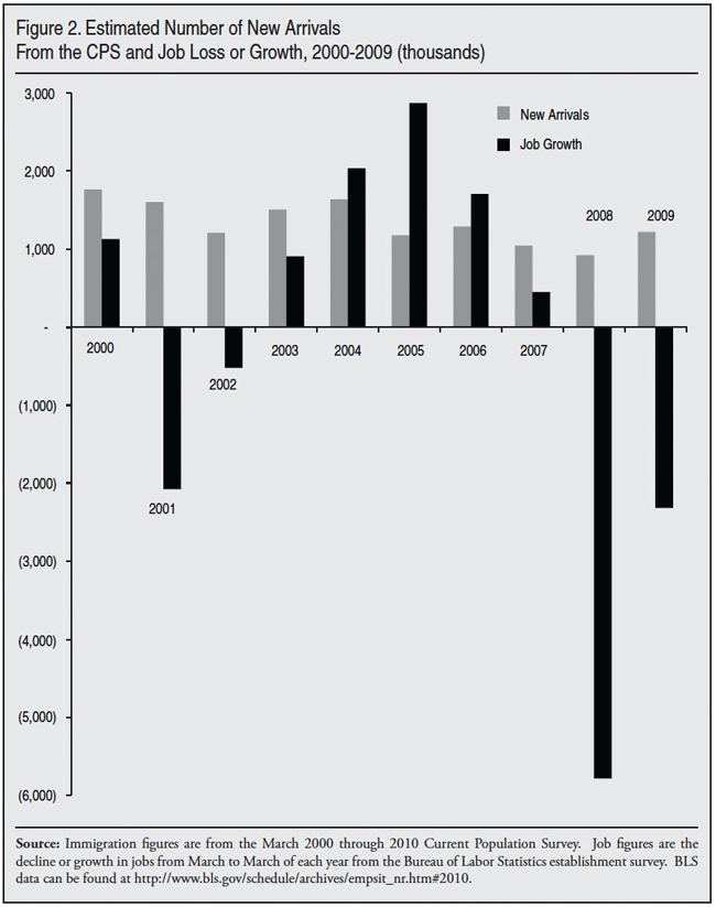 New Immigration and Job Growth. While overall new immigration in the last decade may have been somewhat higher than in the 1990s, this does not mean that there was no variation within the decade. Estimating how immigration may have changed during the decade is difficult. As we have seen in Figure 1, growth in the foreign-born population varied during the decade. The CPS is not designed to measure migration year by year, however. Further, as discussed above, the grouping of multiple years of entry together adds to the difficulty of estimating individual year of arrival data using the CPS. Figure 2 attempts to overcome these problems by subtracting the number in the most recent arriving cohort or cohorts from the previous year’s most recent arriving cohort(s). The difference between cohorts should show the number of new immigrants. So, for example, to estimate the number who arrived in 2009, the 3.5 million immigrants who arrived between 2006 and 2009 (shown in the 2009 CPS) is subtracted from the 4.7 million who arrived between 2006 and 2010 (shown in the 2010 CPS). The difference of 1.2 million should be the number who came between March 2009 and March 2010. Since the overwhelming majority of this new immigration occurred in 2009, 1.2 million should be the number of new arrivals for that year and is reported in that way in Figure 2.