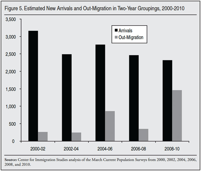 17 In a report titled “Immigrants and Mid-Decade: A Snapshot of American’s Foreign-Born Population in 2005,” ( www.cis.org/sites/cis.org/files/articles/2005/back1405.pdf) pages 2 through 4 and end notes 6 through 14 discuss in greater deal why estimating individual year flows of immigrants is so difficult. That report discusses some of the breaks in the continuity of the data that make year-to-year comparisons difficult. One key problem with the kind of analysis done in Figure 2 is sampling variability. The margin of error using a 90 percent confidence interval for the 3.5 million arrivals (2006-2009) is about 180,000 and for the 4.7 million arrivals (2006 to 2010) is almost 210,000. This means it is very possible that the actual number of new arrivals 2006 to 2009 is really 3.7 million, while the actual number of new arrivals for 2006 to 2010 is really 4.5 million. If these high and low values are correct, then the number of new arrivals would be 800,000; quite a bit less than the 1.2 million shown in Figure 2 for 2009. Moreover, subtracting one cohort from another in the following year does not take into account the departure of immigrants that occurs over the course of a year. While the number of just-arrived immigrants leaving within just one year is small, it does introduce an potential area of uncertainty. The limitations of this method are also illustrated by the fact that some of the results in Figure 2 do not agree with the results in Figure 1. For example, between 2000 and 2001 growth in the foreign-born is 1.8 million, yet Figure 2 shows only 1.5 million new arrivals. Mathematically it is not possible for the foreign-born to grow by more than the number of new arrivals. This problem exists only in a few years and it almost certainly reflects of sampling variability, which exists in any survey.