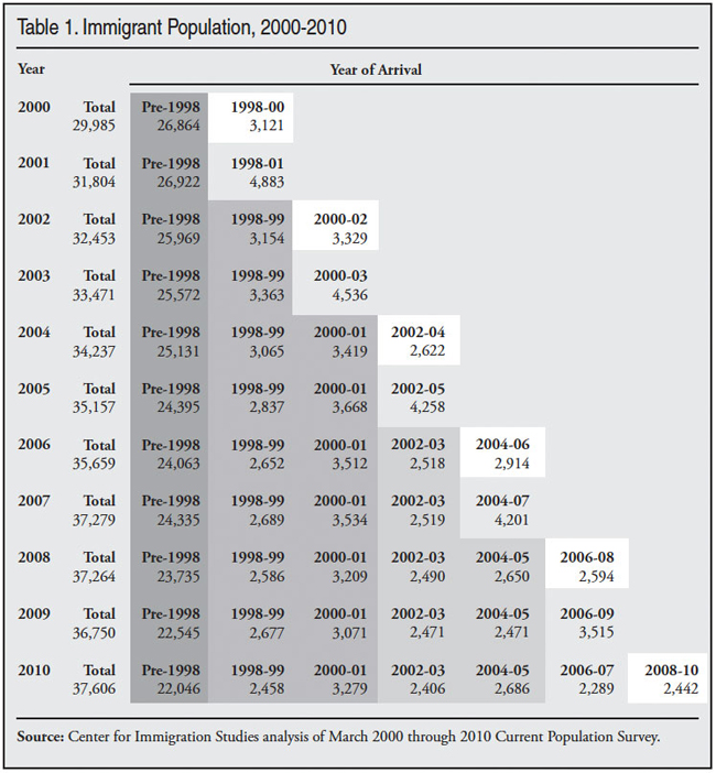 New Immigrants over the Last Decade. Another way to examine trends in immigration is to look at responses to the year of arrival question. The CPS asks individuals when they came to America to stay. However, in order to preserve anonymity, the Census Bureau groups several different years of arrival together in the public-use CPS. Table 1 shows the number of new arrivals as it is grouped in each CPS from 2000 to 2010. So, for example, the table reads as follows: in the March 2010 CPS, 2.44 million new immigrants said they arrived in 2008, 2009, or the first part of 2010. In March 2009, 3.5 million immigrants said they arrived in 2006, 2007, 2008, or the first part of 2009. Table 1 allows the reader to look at individual entering cohorts or to collapse several together.