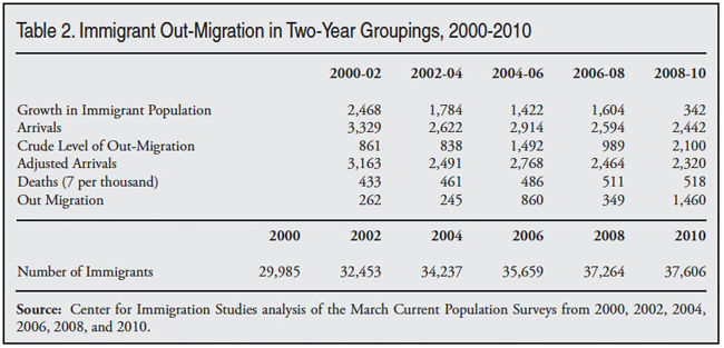 Coming and Going in the Last Decade. The top of Table 2 shows an extremely simple method for calculating out-migration. The first row of the table calculates growth in the foreign-born population for each two-year period. The second row reports the level of new immigration for each two-year period. Table 2 reports new immigrant arrivals by two-year groupings because the public-use data from the CPS group immigrant arrivals in two-year cohorts every other year. (The same information can be found in Table 1.) So, for example, the first row shows that growth was 2.47 million 2000 to 2002 and the second row shows 3.33 million new arrivals 2000 to 2002, based on the 2002 CPS. The third row in the table provides a crude estimate for out migration by subtracting growth from new arrivals. For example, between 2000 and 2002 return migration would be 861,000 (3.33 million minus 2.47 million).