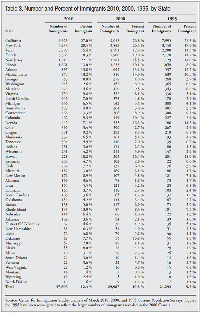 Growth in the Immigrant Population by State. Table 3 compares the number of immigrants in 1995, 2000, and 2007 for each state.23 It also shows the share of the population that was foreign-born in each of those years. While immigrants tend to be concentrated, Table 3 shows they have become less concentrated over time. In 1995 the top five states accounted for 68 percent of the total foreign-born population; in 2000 these same states accounted for 66 percent of the foreign-born and they dropped to 60 percent by 2010. Or, looked at in a different way, these five states accounted for 68 percent of the total immigrant population in 1995, but only 47 percent of the growth in the immigrant population between 1995 and 2010. However, the increasing dispersion of immigrants can be exaggerated. In 2010 the top 10 states of settlement accounted for 72 percent of immigrants; these same states accounted for 75 percent of immigrants in 2000. A change to be sure, but not a very large one. What has happened in the last decade and a half is that the number of immigrants living outside traditional areas of immigrant settlement has increased significantly. But growth in the traditional states has also been substantial. As a result, traditional-settlement states still account for a large, though declining, share of the total immigrant population.