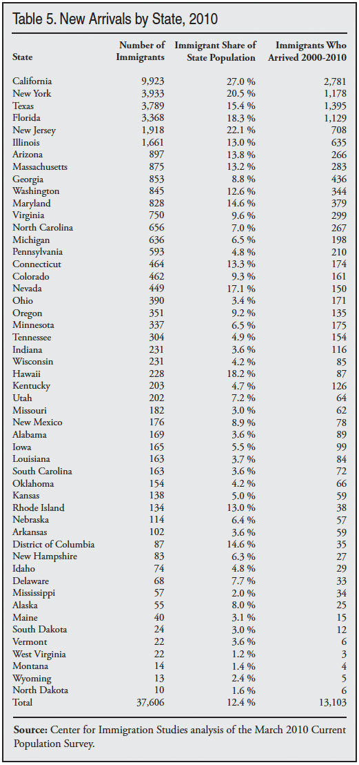 Table 4 shows the 30 states plus the District of Columbia where growth was statistically significant between 2000 and 2010. Table 5 reports the number of immigrants, the share of the population that is immigrant, and the number of immigrants who arrived between 2000 and 2010 in each state. Comparing Tables 3 through 5 shows differing trends across states. For example, New York received a large number of new arrivals over the last decade (1.2 million), but there was very little growth in the size of the foreign-born population. This is likely because a significant share of New York’s immigrant population was older in 2000 than was the case in other states and therefore passed away during the decade. It is also possible that the lack of growth was due to high levels of outmigration of immigrants from the state. Texas, on the other hand, shows 1.4 million new arrivals from abroad and growth in the foreign born of 1.2 million. This is an indication that there is relatively little out-migration of immigrants from that state. Tables 3 to 5 make clear that the pattern of immigrant settlement differs significantly from state to state.