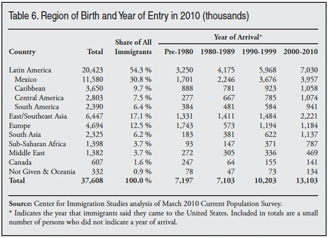 This report examines just-released Census Bureau data collected in March 2010 showing that 13.1 million immigrants (legal and illegal) arrived in the United States between January 2000 and March 2010. This compares to the same data from 2000, which showed 12.1 million new arrivals in the 1990s. This is a striking finding because the decade just completed and the 1990s were very different decades in terms of job growth. There were two significant recessions during the last decade plus the September 11 terrorist attacks. There was no job growth for large parts of the decade. Overall there was a net loss of one million jobs from January 2000 to January of 2010. The finding that immigration was so high in the first decade of the 21st century is important because it is a reminder that immigration is a complex process and not simply a function of labor market conditions.