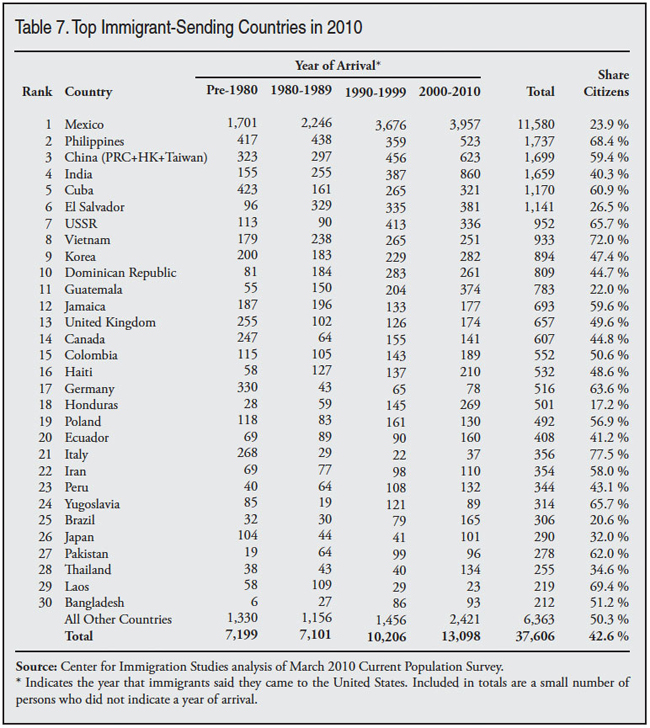 Top Sending Counties. Table 7 ranks the top 25 immigrant-sending countries by the number of immigrants as of March 2010. Mexico is, of course, the largest sending country, accounting for more than six times as many immigrants as the Philippines, the next largest country. As is clear from Table 4, Latin American and Caribbean countries dominate the list of immigrant-sending countries, accounting for almost half of the top 25 countries. One of the striking things about contemporary immigration is that there has been a significant decline in the diversity of immigrants: Mexico accounts for 31 percent of all immigrants in 2010, up from 28 percent in 2000, 22 percent in 1990, and 16 percent in 1980. The top sending country in 1970 was Italy, which accounted for only 10 percent of the foreign-born. The last column in Table 7 shows the share of immigrants from each country who are naturalized U.S. citizens. There is a great deal of variation between countries in the share who are citizens.