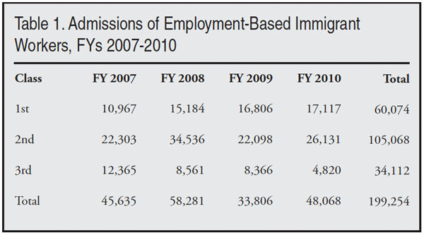 Table 1 shows the admission figures for the last four years in the categories as I have defined them. (Admission/adjustment figures for immigrants are once-in-a-lifetime numbers, and are more useful than admission data for nonimmigrants.) The numbers below are for workers only, and do not include their dependents, who are admitted (or adjusted) at the same time as the workers.