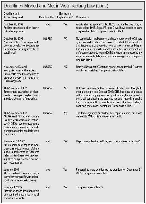 Failures Document Fraud. The visa tracking law required that employment authorization documents for refugees and asylees include a photograph and fingerprints by November 2002. This requirement has not yet been met. Employment authorization documents, which give the holder the legal right to work in the United States, are some of the most sought-after immigration documents. Absent biometric identifiers, employment authorization documents may be easily swapped, sold, or counterfeited. While refugees and asylees do not represent a huge number of people relative to other visa categories, the smaller size of the program should have made it relatively easy to incorporate a photograph and fingerprints on these employment authorization documents. Moreover, the more secure documents could serve as the prototype for work authorization documents for all non-immigrants (aliens granted permission to enter the United States for a particular purpose and limited duration, such as students and guest workers) and for the hundreds of thousands of aliens granted Temporary Protected Status in the United States. The fact that this requirement has not been met is a troubling sign because it suggests that the Administration does not fully appreciate the demand for work authorization documents or the ease with which they are fraudulently used. The visa tracking law also required the Department of Homeland Security (DHS) to have the ability by September 30, 2002, to verify that the fingerprints on Border Crossing Cards match those of the holder prior to their entry into the United States. Border Crossing Cards permit Mexican nationals to enter the United States for periods of up to 72 hours without having to apply for a visa each time they seek entry. These cards are in high demand among Mexicans who live in border areas or whose business involves routine cross-border activities. The administration has expended significant resources to create and issue secure, machine-readable, biometric Border Crossing Cards to deter fraudulent use and counterfeiting. While DHS has purchased several machines capable of reading standard identification cards, the majority of them are not able to read and compare the digitized fingerprints on the Border Crossing Cards. Without this capability, DHS has no way to ensure that the presenter of the card is the same person to whom it was issued. Information Sharing. One of the most important reforms required by the visa tracking law is the creation of an integrated data system called Chimera. The Chimera system is supposed to contain biometric identifiers (a photograph and fingerprints), immigration and law enforcement records, and intelligence information on every visa applicant. Chimera is to be used to determine the admissibility and deportability of aliens, since it will include any available evidence of prior immigration violations, criminal records, or terrorist connections. Prior to September 11, 2001, the Immigration and Naturalization Service (INS) had several separate data systems that were incompatible with one another and with other federal law enforcement agencies, including the Federal Bureau of Investigation (FBI). For example, the INS had separate databases for criminal/illegal aliens, for naturalization applicants, for non-immigrant, and for lawful permanent residents. While there was some data sharing among these systems, there were critical gaps. The data system for criminal/illegal aliens, called IDENT, was the only system that stored an electronic fingerprint and photo, but it was not compatible with the FBI’s criminal database, NCIC. The database for naturalization applicants was incompatible with IDENT, as well, so there were instances of aliens who were in deportation proceedings in one INS District being naturalized by another INS District. The purpose of Chimera is to combine all available data on aliens in one database to which all immigration, law enforcement, and intelligence officers have access. This will allow, for example, a CIA agent who receives intelligence about a suspected terrorist to make that intelligence available to immigration inspectors who can then prevent the alien from gaining admission into the United States. The lack of communication between federal agencies clearly played a role in facilitating terrorism in the past. Khalid al Midhar, who may have been the pilot on American Airlines flight 77 on September 11th, was identified by the CIA as a terrorist in January 2001. He was permitted to enter the United States in August 2001, however, because the CIA never put his name on the watch lists that should have led an immigration inspector to deny him entry. Chimera would ensure that immigration inspectors have access to CIA intelligence. It also would contain fingerprints of all visa applicants, so a suspected terrorist would have a much more difficult time using a stolen or fraudulent identity to gain admission. This automated, integrated identification and tracking system for all visa applicants does not guarantee safety from terrorism, but it gives immigration and other law enforcement personnel an essential tool to prevent terrorists from being given legal permission to enter the United States in the first place or to remain in the country if they violate the terms of their visas. The Administration’s failure to report any progress in creating Chimera and its failure to appoint the nine-member commission required by the visa tracking law to oversee the development of Chimera are perhaps the most significant missed deadlines. Without the Chimera system, there is no permanent, integrated data-sharing system that will allow all law enforcement and intelligence agencies to communicate in real time and to access all available data on non-citizens, including biometric identifiers. Another area related to information sharing that has not been implemented concerns the failure to report to Congress on the feasibility of establishing a North A