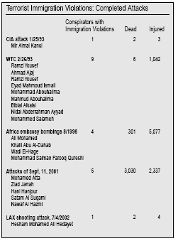 This report also covers foreign nationals closely associated with Hamas, primarily engaged in terror financing, and creating foundations and shell corporations for the purposes of raising and laundering money. Those discussed here who are aligned with Hizballah were usually engaged in providing material support to terror organizations operating abroad such as procuring explosives, money, night vision goggles, sleeping bags, radios, camouflage suits, global positioning equipment, and identification and travel documents. These operations were conducted in a manner similar to traditional organized crime families. Al Qaeda operatives discussed here were strategically positioned throughout the United States -- often in places not previously associated with terrorist activity, such as Peoria and Chicago, Illinois; Columbus, Ohio; Baltimore, Maryland, and its suburbs; Seattle, Washington; Portland, Oregon; Minneapolis, Minnesota; and upstate New York. A couple of al Qaeda operatives covered in this report are still at large and currently unindicted, including Adnan Shukrijumah and Aafia Siddiqui, yet are included here because they are high on the FBI's list for questioning and spent long periods of time in the United States. The lists found throughout this report (under immigration benefit subject headings at the end of each section) begin with Mir Aimal Kansi, who in January 1993 opened fire outside CIA headquarters in McLean, Virginia; the most recent cases, from 2004, involve the surveillance cases in New York City; in Charlotte, North Carolina; Nashville, Tennessee; Las Vegas, Nevada; and southern California. All told, 21 of these terrorists committed five attacks against U.S. interests causing a total of 3,341 deaths and 8,463 injuries; 29 were involved in 12 unexecuted plots. Five hijackers from 9/11 had clear immigration violations, while one (Marwan Al-Shehhi), had a possible violation; thus, 13 hijackers are not included in the chart below. I do not discuss the 9/11 plotters in this report or other earlier terrorists in detail, as each is covered in 9/11 and Terrorist Travel. In 47 instances, immigration benefits sought or acquired prior to 9/11 enabled the terrorists to stay in the United States after 9/11 and continue their terrorist activities. This includes three terrorists whose visas or entries into the United States were on 9/2/01, 9/6/01 and 9/10/01. In three instances, terrorists sought immigration benefits after 9/11. One political asylee associated with the 9/11 hijackers was denied and deported after having previous immigration violations. The second managed to maintain his student status in the United States through mid-2002. A third gained legal permanent residency status in 2002. Although each of these 94 terrorists had committed an immigration violation of some kind, criminal charges alone were brought in at least 37 instances and immigration charges in 18. Indictments in 50 cases included both immigration and criminal charges. There have been a total of 15 deportations and 23 criminal convictions. In 16 instances, individuals were not convicted (e.g., the six 9/11 hijackers), are being held as an enemy combatant (e.g., Khalid Sheikh Mohammed), or have fled the United States (e.g., Anwar Al-Aulaqi, an imam associated with the 9/11 hijackers and believed to be now in Yemen.) Many of these terrorists may have been affiliated with one or more terrorist organizations, but 40 individuals are associated with al Qaeda, 16 with Hamas, 16 with either the Palestinian or Egyptian Islamic Jihad, and six with Hizballah are specifically identified. Three are unaffiliated but of a radical Islamist background; one each is affiliated with the Iranian, Libyan or former Iraqi governments; one each is associated with the Pakistani terrorist groups Lashkar-e-Taiba and Jaish-e-Mohammad; and the affiliations of eight others indicted or detained on terrorism-related charges are unknown. While I was able to rely on legacy Immigration and Naturalization Service immigration alien files and legal documents for over half of this study, the most recent entries draw on multiple news accounts when indictments are unavailable. The immigration alien files are derived from the 9/11 Commission staff report 9/11 and Terrorist Travel--where statutory authorities permitted us access to normally inaccessible immigration alien files--for 46 of these individuals. In another 24 cases, we were able to rely on legal documents (often with multiple defendants). Valid visas were held upon entry by 35. This number includes the six 9/11 hijackers known to have sought enhanced immigration status while in the United States. Student visas to attend various universities were used by 18 individuals and four had applications approved to change status from tourist to student. Another 17 used a visitor visa--either tourist (B2) or business (B1)--to enter. In at least 13 instances, the foreign nationals in this study overstayed their visas. In all 94 cases, the terrorist sought to stay in the United States once he or she had successfully entered. All those who engage or intend to engage in terrorist activity upon entry into the United States have committed fraud under U.S. immigration law. However, traditional fraud used to attain some form of immigration benefit, e.g. false documentation, lying about material facts, or entering into a sham marriage, was frequent. About two-thirds of the individuals studied (59) clearly engaged in fraud in order to enter or embed in the United States, and they did so multiple times (79 instances). Discovery of such fraud usually occurred while the individuals were attempting to upgrade their status in some way (e.g., obtain work authorization, become legal permanent residents, or become naturalized). Representatives of every terrorist organization in this study used fraud to some degree, although certain groups appear to use characteristic patterns of tactics in their travel operations. The lev