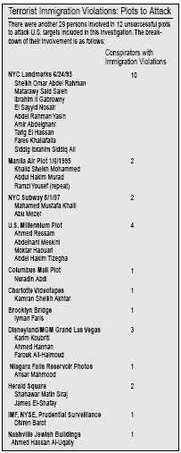 Introduction Background What requires emphasis is the ease with which terrorists have moved through U.S. border security and obtained significant immigration benefits such as naturalization. The security gaps that existed then still, in many instances, exist today. My work on the 9/11 Commission made it clear that terrorists need travel documents for movement at some point during their journey here as much as they need weapons for operations. Once within U.S. borders, terrorists seek to stay. Doing so with the appearance of legality helps ensure long-term operational stability. At the 9/11 Commission we called this practice embedding, a term also used in this report. Terrorists have used just about every means possible to enter the United States, from acquiring legitimate passports and visas for entry to stowing away illegally on an Algerian gas tanker.3 This study reviews 94 individuals closely affiliated with terror organizations, whether through overt terrorist acts, connections to criminal activity in support of terror, or terror financing. Most have been convicted or indicted. It summarizes how these terrorists have successfully sought legal immigration benefits through fraudulent means and the legal action (if any) taken against them. This report only includes the six 9/11 hijackers who abused immigration benefits to stay in the United States. Some of the terrorists discussed here have engaged in a variety of al Qaeda-related plans targeting American civilians within the United States. As each plot unfolded, cell members who were in place within the United States became operational. We know that at least after September 11, the plots discussed here originated in Afghanistan under the guidance of 9/11 mastermind Khalid Sheikh Mohammed (KSM). All aspects of the training, along with spiritual and tactical guidance, developed there. The plots were conceived with multiple objectives: they sought to achieve mass casualties, economic damage, destruction of infrastructure, and terror. Some plots never progressed beyond an idea's genesis, while others reached operational stages before becoming defunct. While U.S. intelligence and law enforcement have identified at least a couple of dozen potential plots, the only plots discussed here are ones where the ways and means of the Al Qaeda operatives' immigration histories are publicly available. KSM primarily hatched these plots until his capture by Pakistani authorities outside of Islamabad in March 2003. KSM grew up in Kuwait in a religious family and allegedly joined the Muslim Brotherhood at the age of 16. According to the 9/11 Commission Report, "KSM claims . . . to have become enamored of violent jihad at youth camps in the desert."4 In 1983, KSM enrolled first at Chowan College, a Baptist school in Murfreesboro, North Carolina, and then at North Carolina Agricultural and Technical State University in Greensboro. There one of his classmates was Ramzi Yousef's brother, who himself later became an al Qaeda member while Yousef planned the 1993 World Trade Center and Bojinka plots with KSM. In 1986, KSM returned to Pakistan for jihadi military training. Not swayed in the least bit by American culture or democratic ideals, KSM told his captors in 2003 that even during his U.S. stay he considered killing the radical Jewish leader Meir Kahane when Kahane lectured in Greensboro.5 Although there is no evidence KSM ever returned to the United States, he did obtain a U.S. business/tourist visa on July 23, 2001 under an alias of a Saudi citizen, perhaps due to rising concern about the friction between 9/11 ringleader and pilot Mohamed Atta and pilot Ziad Jarrah.6 Overview