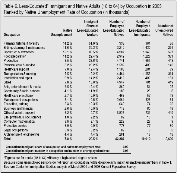 Table 6 shows adults with only a high school degree or less in each occupational category. The table reads as follows: In the building cleaning and maintenance category unemployment is 11.6 percent among less-educated natives. The second column shows that 39.3 percent of less-educated workers in that occupational category are foreign born. The table shows that there are still 14.4 million less-educated adult natives employed in the first five occupations listed and an addition 1.7 million less-educated unemployed adults natives in these five occupations. If we include personal care and service occupations, then there are an additional 1.6 million less-educated adult natives in a "high-immigrant" occupation, and 143,000 more unemployed. This comes to 37 percent of all less-educated adult natives. The correlation between the immigrant share of less-educated workers and the unemployment rate for less-educated natives is 0.90, and the square of the correlation is 0.81. This certainly supports the high correlations found in Table 5 when all workers are considered.