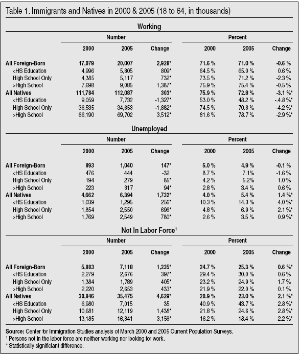 • As for the less-educated, between March of 2000 and 2005 the number of adult immigrants (legal and illegal) with only a high school degree or less in the labor force increased by 1.6 million.