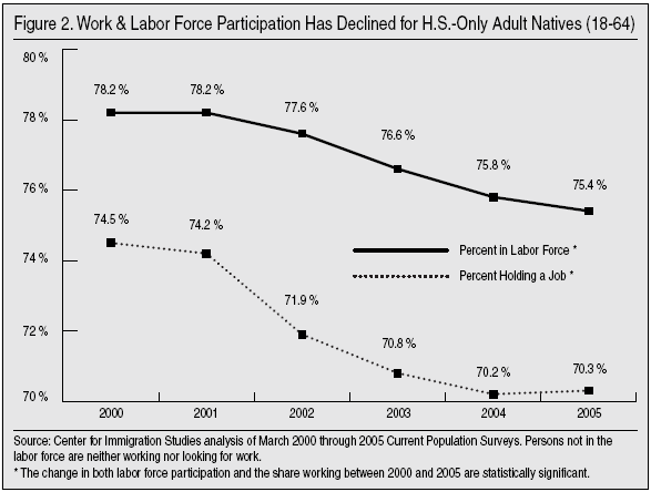• Of perhaps greatest concern, the percentage of adult natives without a high school degree who are in the labor force fell from 59 to 56 percent between March 2000 and 2005, and for adult natives with only a high school degree participation in the labor force fell from 78 to 75 percent.