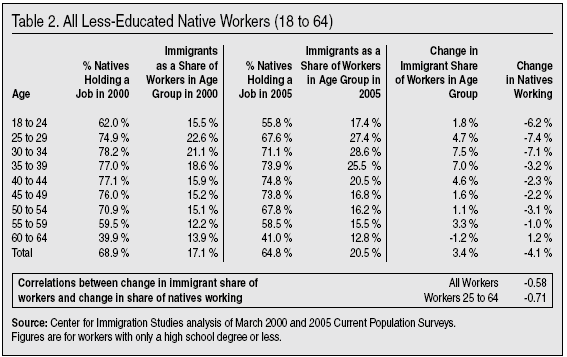 Natives and Immigrants by Age. Table 2 reports the share of less-educated natives working in 2000 and 2005 by age. It also shows the immigrant share of workers in each age group in 2000 and 2005. The bottom of the table shows the correlation between the changing immigrant shares of each group and the share of natives holding a job in each age group.14 The correlation is negative 0.58. A negative correlation means that as immigrants increased as a share of an age group, the percentage of natives working in that same age group decreased. Any correlation larger 0.5 or -0.5 is usually seen as meaningful. The square of a correlation, in this case 0.38, can be interpreted to mean that 38 percent of the variation in the changing percentage of less-educated natives holding a job across age groups is explained by the growth of immigrants in the age group.