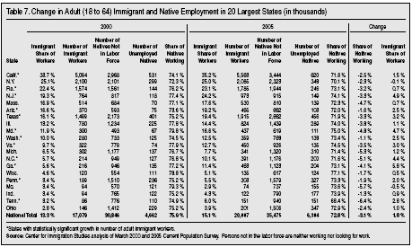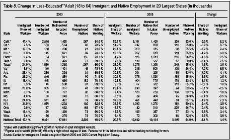 Immigration in the Largest States. Table 7 reports employment figures for immigrants and natives in 2000 and 2005 for the 20 largest states, 12 of which saw a statistically significant change in the number of immigrant workers. When we look at all workers, there is some evidence that immigration may have harmed natives. In the 12 states with statistically significant growth in the overall number of immigrant workers, the share of adult natives working declined by 3.4 percentage points on average, compared to an average decline of 2.3 percentage points in the other eight states in the table.21 However, there are clearly exceptions to this general pattern. Illinois and Michigan, which saw a significant decline in manufacturing jobs in recent years, were not among the states with a big increase in the immigrant share of less-educated workers. Moreover, there is no strong correlation between declining overall native employment and growth in immigrant workers. This of course may be the result of limited size of the CPS sample in some states, making it impossible to determine the actual impact of immigration. In addition to the issue of sample size, it is important to realize that states are not discrete labor markets, this is particularly true of large states with many large metropolitan areas. Unfortunately, comparisons across metropolitan areas are not possible using the CPS public use file. But even comparisons between cities might not be meaningful because as we mentioned earlier, we live in a national economy.