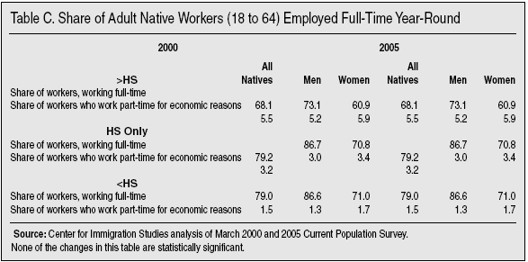 Full-time Work Has Also Declined. So far we have considered those holding a job collectively. While the share of less-educated natives holding a job or in the labor force has declined, it is possible that this situation is at least partly ameliorated by a rise in the share of native workers who are employed full-time. (Full-time is defined as usually working 35 hours a week or more.) Table C in the appendix examines this question. The share of native workers employed full-time actually declined slightly between 2000 and 2005. However, these declines are not statistically significantly. While the declines are not statistically significant, they certainly do not indicate that more natives are working full-time. As we have seen, the share of natives in the labor force has declined significantly and this has not been offset by a rise in the share working full-time. This is true for both men and women.