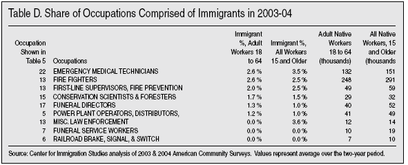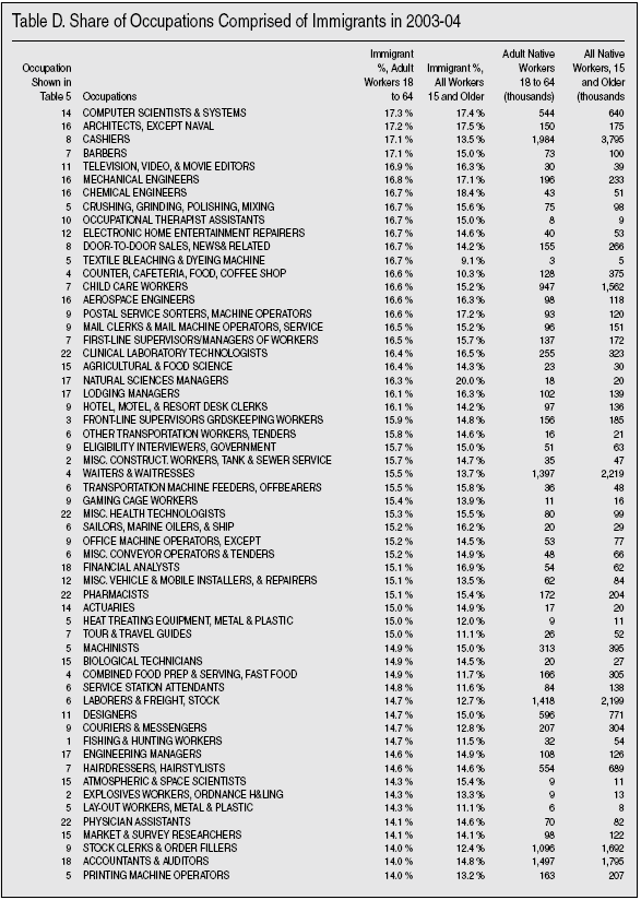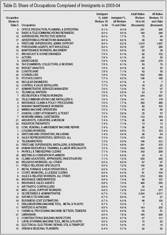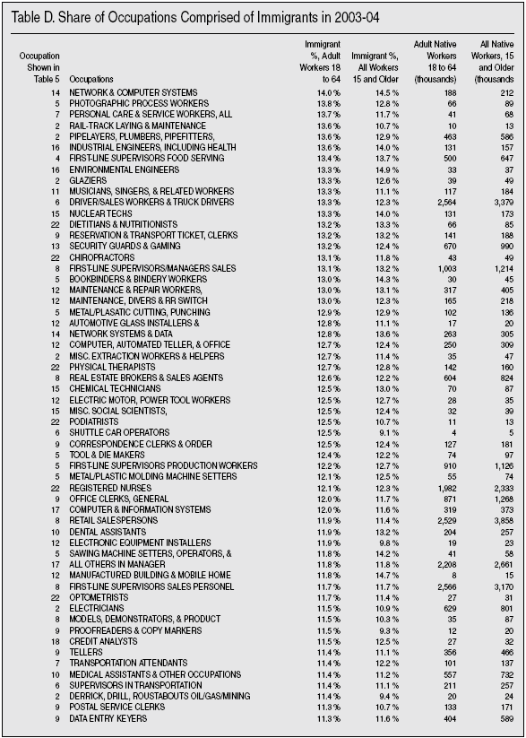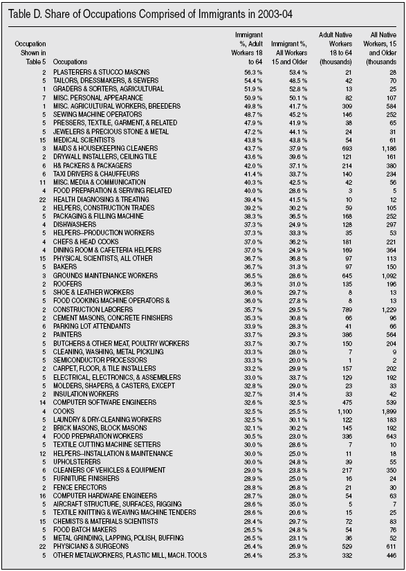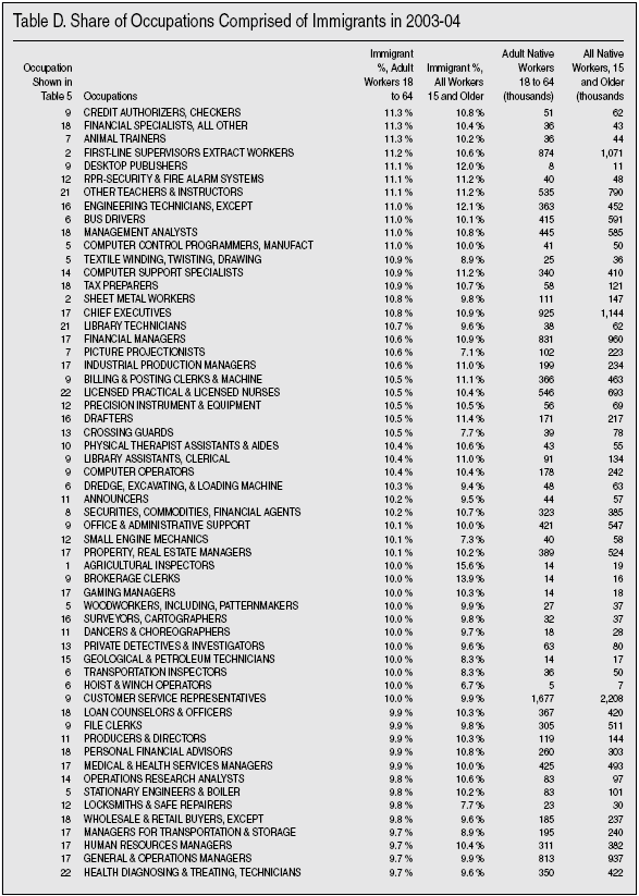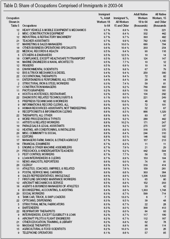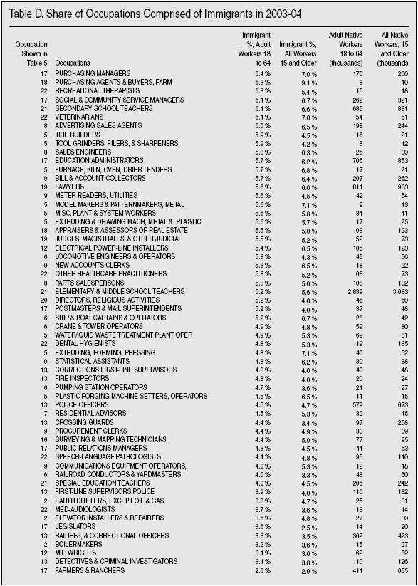 Detailed Look at Occupations. There is another data source that allows a more detailed look by occupation. The American Community Survey (ACS) is almost six times larger than the Current Population Survey. While 2005 ACS data are not yet released, by combining 2004 and 2003 ACS data we can get good estimates that should be reliable for detailed occupations and is still recent. Table D in the appendix at the end of this Backgrounder shows over 470 occupations for which there are data for 2003 and 2004. By examining occupations in this very detailed way we can see if there are occupations comprised only of immigrants. The far left column of Table D provides a number that corresponds to the occupational categories shown in Table 5. So if you want to know about construction occupations, simply look down the list in Table D for occupational category 2, which is the occupational category shown in Table 5. Probably the most important thing about Table D is that there are just four occupations out of 473 in which the majority of adult workers are immigrants. These occupations employ only 315,000 immigrant and native-born adults, and account for less than two-tenths of 1 percent of all adults 18 to 64 holding a job, and only 1 percent of all immigrants are employed in these immigrant-majority occupations. It is simply not correct to say that immigrants only do jobs that Americans don’t want, when Table D shows the majority of workers doing just about every single job in America are native-born. The tiny number of immigrant- majority jobs falls to just 3 when teenagers (ages 15 to 17) and persons over age 64 are included.